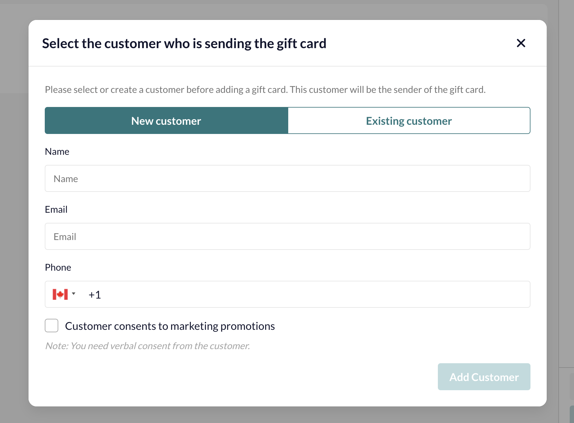 If you are collecting marketing consent in person, confirm you have verbal consent before checking the consent box. - Complete the remaining gift card fields shown on screen, then finish checkout as normal.